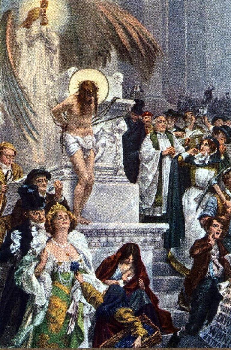 Goetze depicts several types familiar to late-Victorian society. In the left-hand corner there is the lady of fashion flirting shamelessly with her escort. Behind them is the scientist, so infatuated with his bubbling test-tube that he is blind to Christ. Above him is the sports-enthusiast, lost in the horse-racing pages. At the base of the altar huddles a poor mother with a sickly child. Turned in on herself by misery, she also has her back to Christ. To the right, a ragamuffin newsboy hawks the latest tabloid scandal sheet. A pompous cleric walks along, eyes straight ahead. Behind the cleric is a scheming businessman whose god is money. Next to him a corrupt judge is pouring over his lawbooks. In the far background a demagogic politician is haranguing the crowd. Only the nurse looks upon Christ, and reacts with sorrow and compassion.