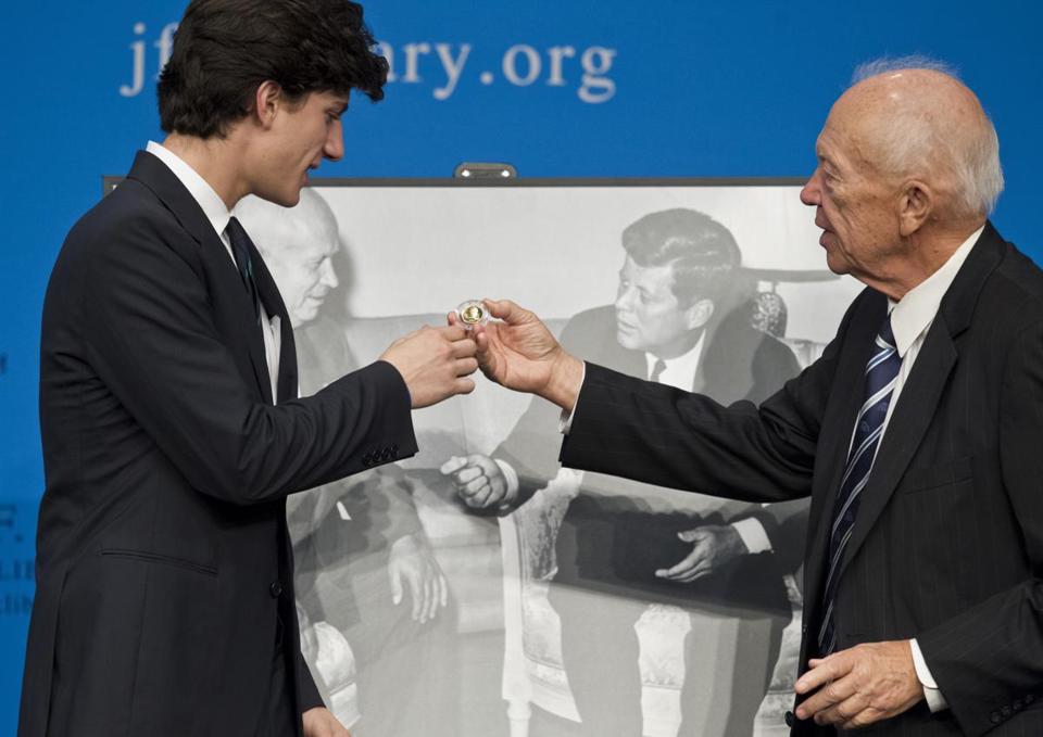 PHOTO: Jack Schlossberg, grandson of President Kennedy, receives a Russian coin from Sergei Krushchev, son of Nikita Krushchev, Kennedy Library, Boston, October 14th, 2012.