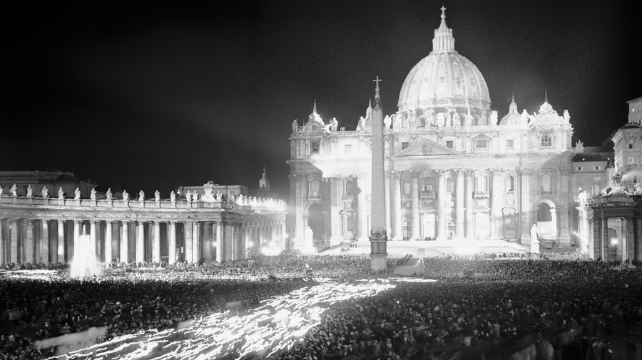 Youths from Catholic Action, carrying lighted torches, form a giant cross of light around the central obelisk in St. Peter’s Square in Vatican City on Oct. 11, 1962, the opening day of the historic Second Vatican Council.